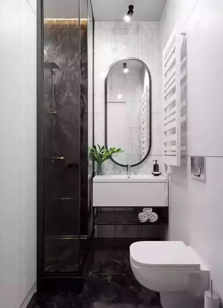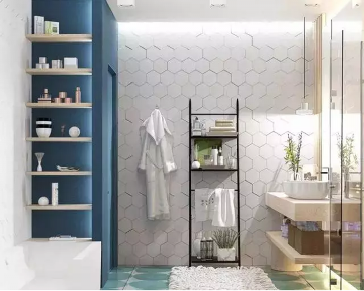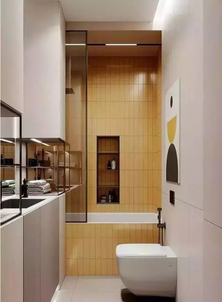 馬桶后上方是很多人會忽略的收納黃金區域,我們可以在這里安裝電熱毛巾架或是普通置物架。