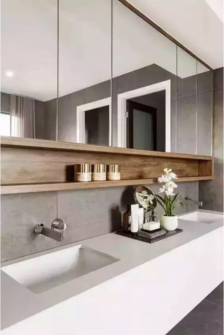 洗漱區的核心角色是洗臉臺,洗臉臺的上方、下方是把東西“藏起來”的好地方。一般而言,上方都會安裝便于梳洗的鏡子,我們可以用鏡面柜取代鏡子,一物兩用,利用率更高。