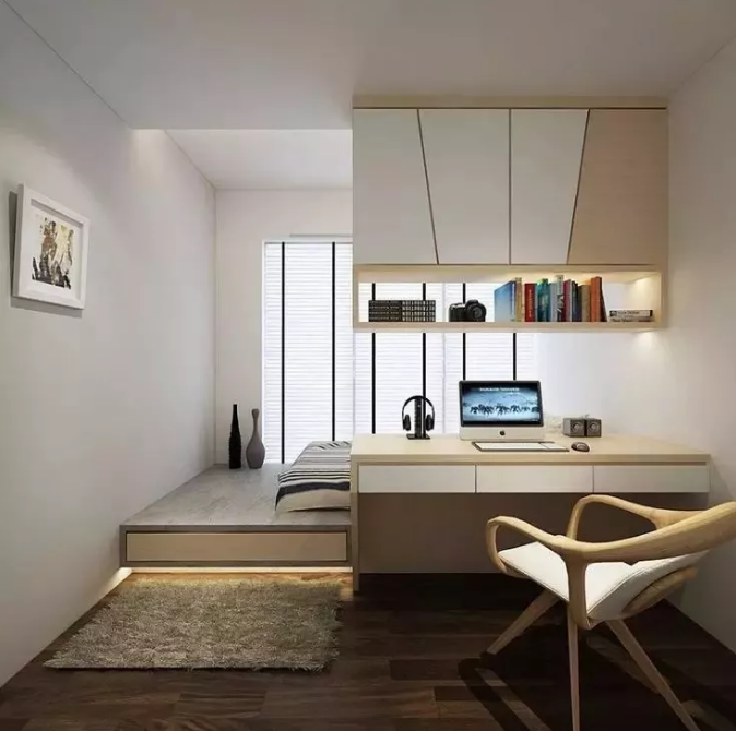 也有一些屋主,喜歡的是榻榻米地臺的顏值,所以會選擇舍棄榻榻米地臺的儲物能力,把地臺做矮、做大一些,再擺上一張床,更有時尚感。