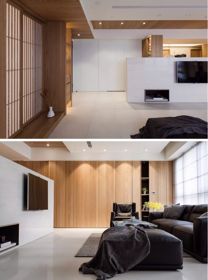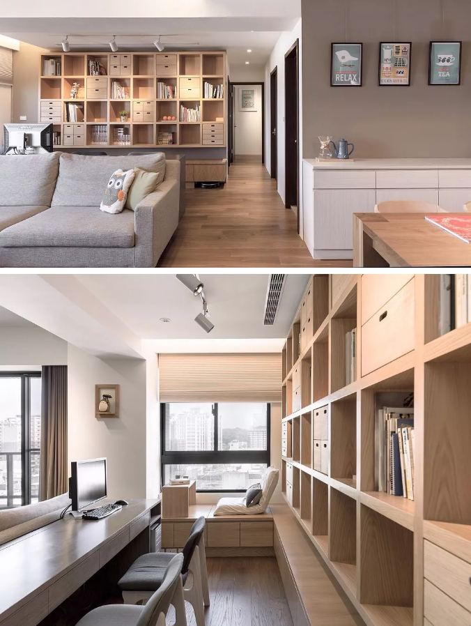 依據(jù)不同的空間屬性賦予隔斷強大的收納功能,實現(xiàn)一物多用,例如客廳和書房間的正面書柜墻設計,隔斷與收納完美結合,不浪費任何空間。