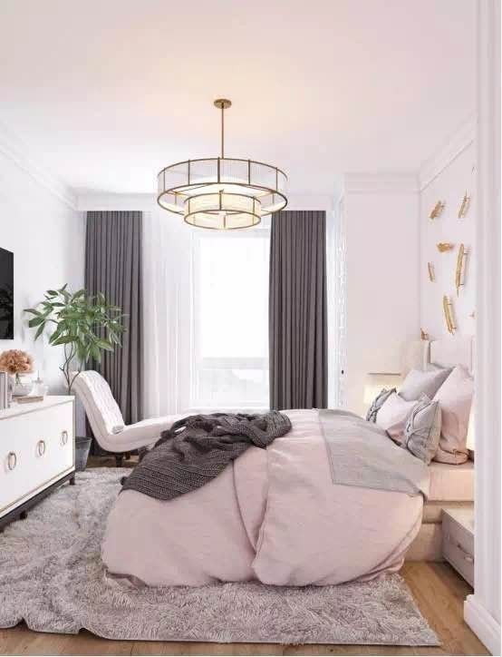 臥室的窗簾更注重功能性,要充分避光以保證睡眠。臥室內窗簾最好選擇落地款,以免窗簾過短而漏光。