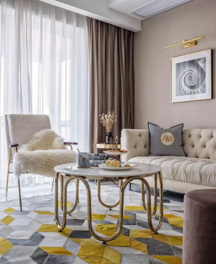用窗簾呼應地毯、沙發等其它軟質家裝的色感,是簡單又保險的做法