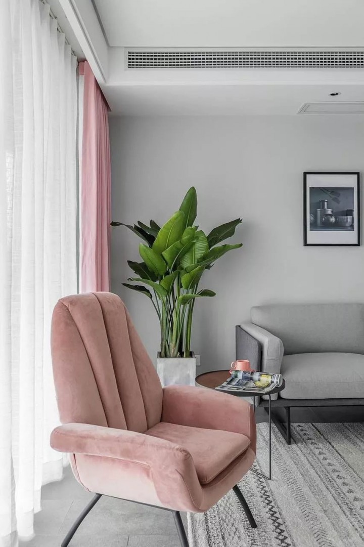 窗簾的粉紅既不花哨又不會單調無趣,且與灰色沙發、木紋茶幾融成一個十分和諧的視覺整體。