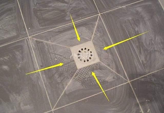 也有人把它叫做回字鋪貼法。它是平時我們在工地經常能看見的一種做法。這種施工方式是先將整塊瓷磚按對角切割成4塊,中間部位預留出來安裝地漏。它的好處就是四面瓷磚是梯形的,這樣瓷磚上的積水可以順著坡度快速的流向地漏。所以這種方式的排水速度也是比較快的。