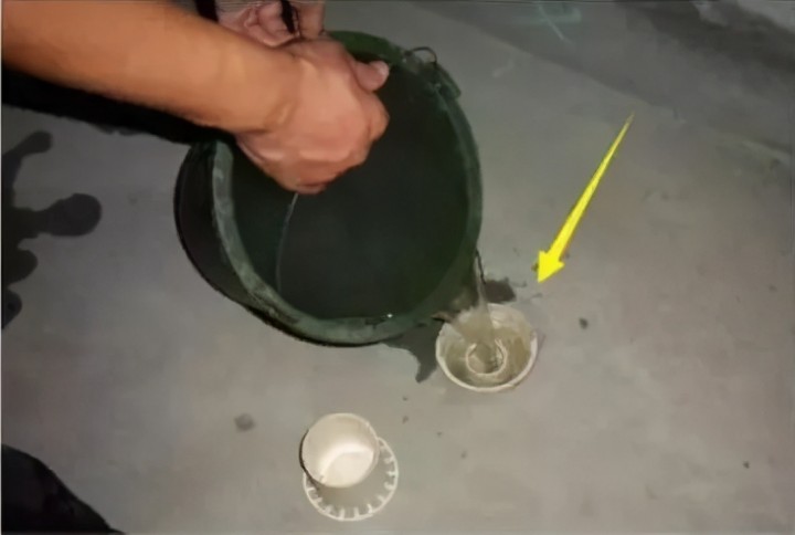 用水桶向下水道注入清水,測試水流是否通暢。