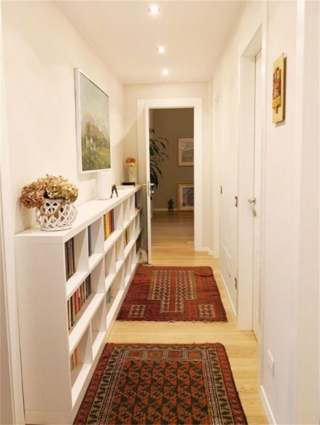 墻面增設隔板,擺放一些好看的裝飾物,形成一個開放式展示區,緩解過道的冗長感,增加趣味和藝術氛圍。