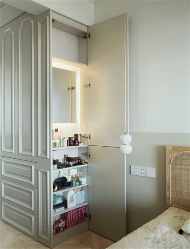 也可以直接裝厚度在10-15cm左右的鏡柜,既是穿衣鏡又是小型儲物間,非常適合小戶型。