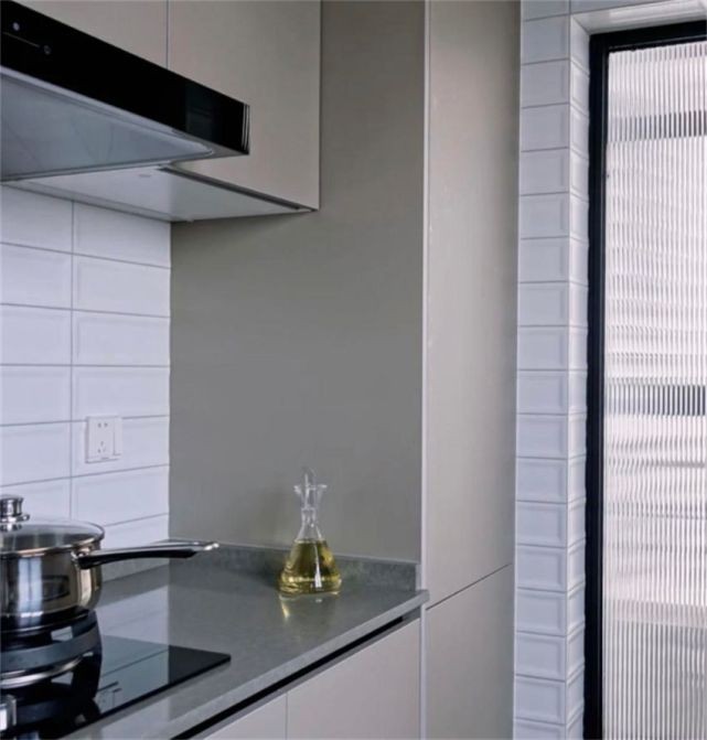 煙道部分不要砌墻,留出15cm打薄柜,底部和地柜保持齊平,作為調味品收納柜比白白浪費好多了!