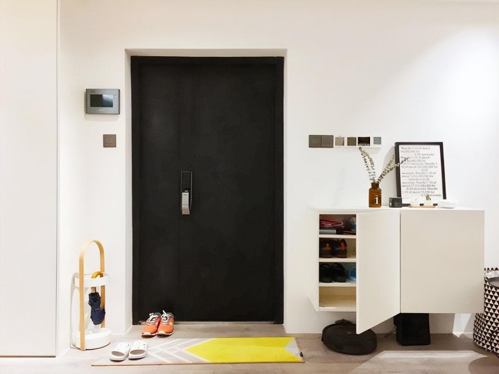 或者直接將鞋柜平行放在入戶門前,一邊靠墻,形成一個相對獨立的空間,玄關完美自造!正對入戶門的鞋柜還可以起到隔斷作用,開門再也不怕屋里被看光光了。鞋柜隔斷可以做到頂,如果怕光線受影響,也可以做半高。