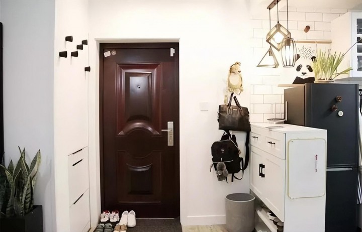 這兩種戶型,除了沒有玄關不方便之外,還有就是開門就能看到室內布置,私密性差一點。所以,自造玄關就是要利用鞋柜造出一個好用的玄關,同時對室內布置起到隔檔緩沖的作用。