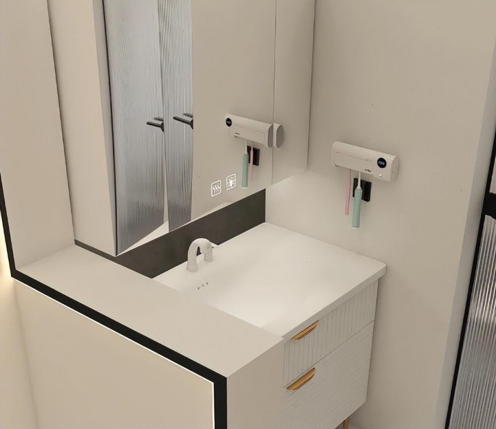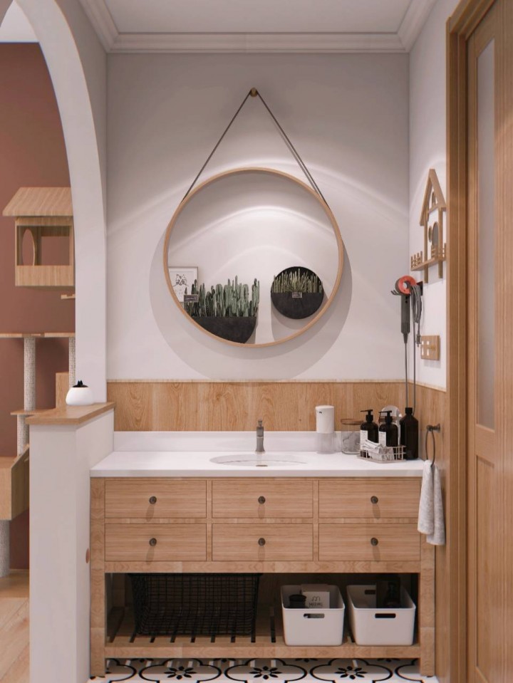 因為這樣的干區設計,美觀性得到了保證,但用于收納的設計很少,平時的洗漱用品只能放在臺面上,讓原本很漂亮的干區變得很亂,造成很大的“翻車”。