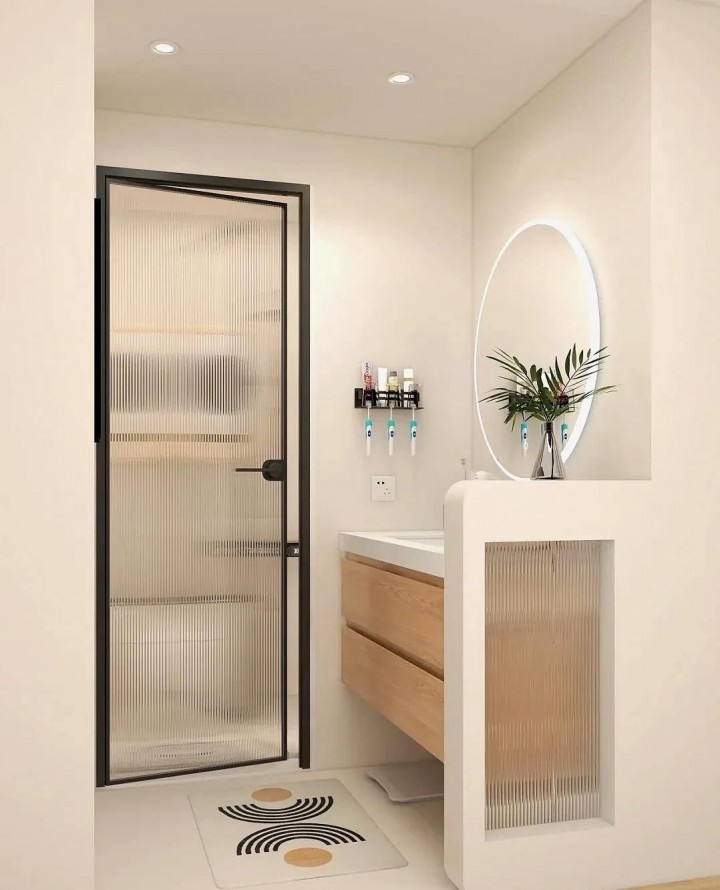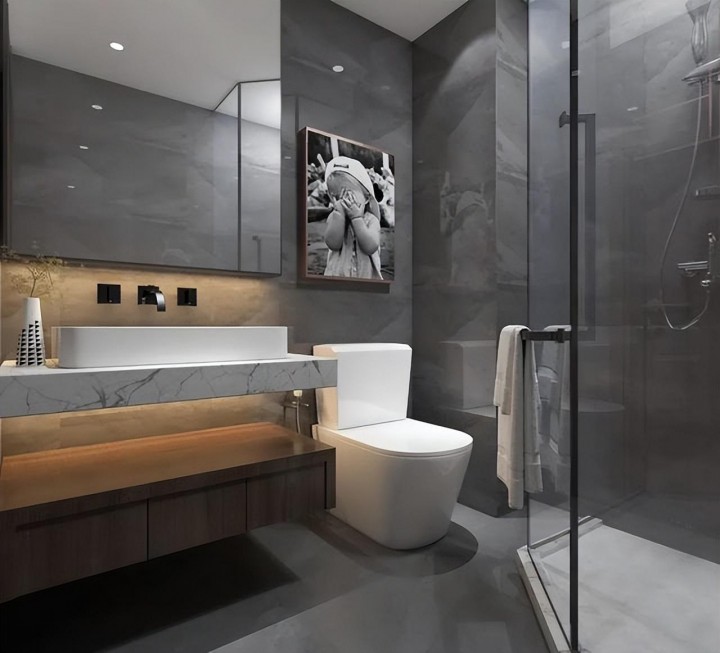 這也就導致了,只要是裝修,我們都會盡最大的努力做一個干濕分離的設計,并把重點放在干區。它一定要有好看的外觀,比如半墻設計、懸掛式浴室柜、智能鏡子、長虹玻璃等,只是為了得到別人的贊美。
