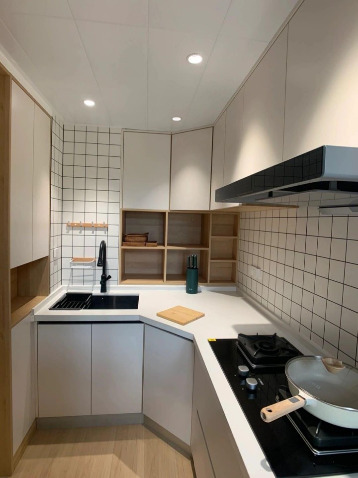 由于廚房的面積不大,在設計櫥柜的時候,人們往往想更好的利用角落的位置,所以在角落的位置,將里面的隔斷做成一個整體而在柜門的設計和鉸鏈的使用上,達到最大的開啟角度更是提高了實用性。