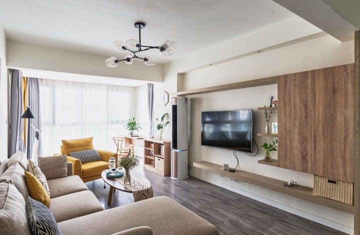 你打算在客廳里裝柜機還是掛機?提前確定好,并且根據空調種類,預留好空調孔的位置(在頂部還是在底部)。如果客廳面積不超過30㎡,更建議選擇掛機空調。使用上更節省空間,視覺上的壓抑感也更少。