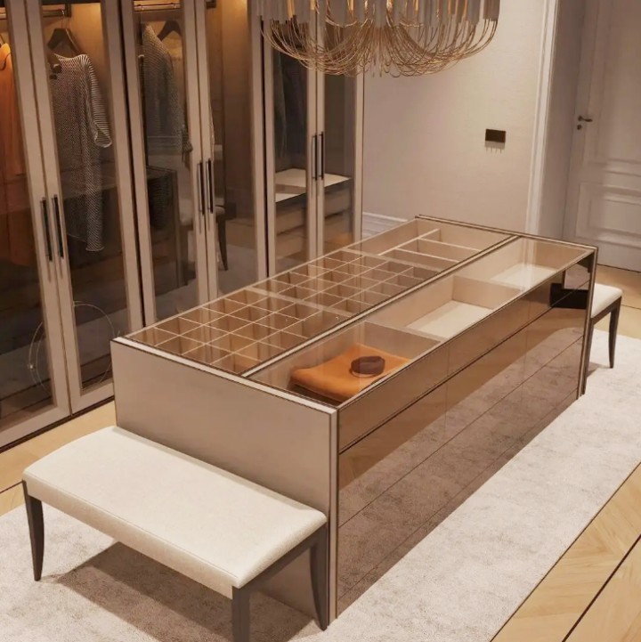 在空間足夠的情況,衣帽間增加島臺也是有必要的。可以很好帶來收納的便利,如首飾、包包,我們可以通過抽屜式的收納,分類拿取更方便。