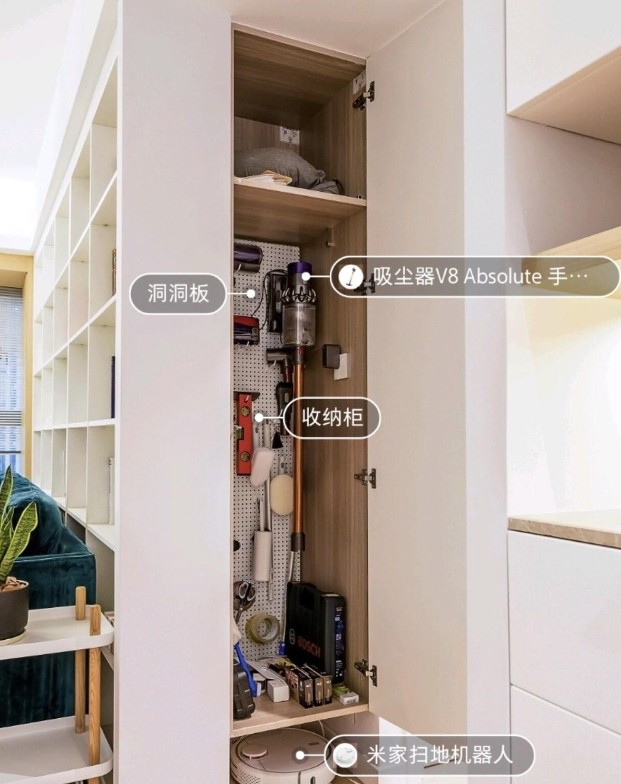 在陽臺有1.5m寬的時候,多了一個窄柜的實用性就相當明顯的。特別是對于一些“長”的清潔用具的收納,有它真的方便許多。洗衣機、烘干機擺放在這邊,也能用于一些洗衣液的存放,動線更短。