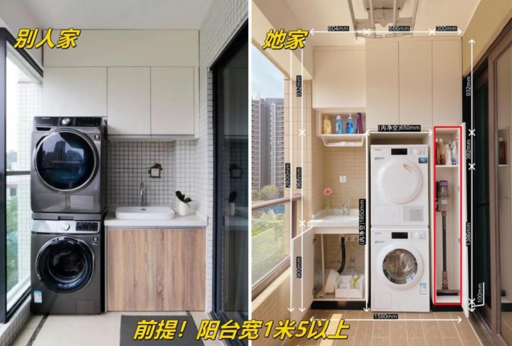 陽臺裝柜子的很多,但真正懂得增加一個窄柜還是偏少的,上圖的對比就是真實的寫照。