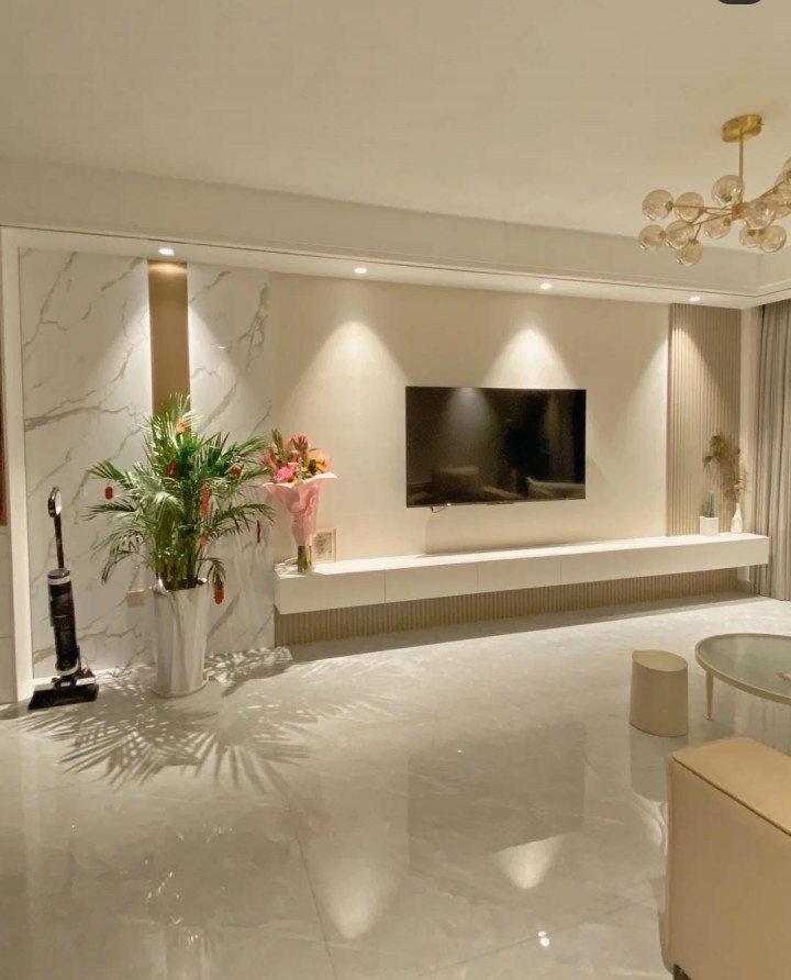 天花板是15個燈頭的滿天星燈,全黃銅材質非常有質感,水晶燈罩非常透明,亮度充足。三個光源營造出不同的氛圍感。內置射燈,空間光源均勻地分布。整個空間更明亮、更大氣,鋪滿地磚,營造視覺上的延伸感,讓空間顯得更大。