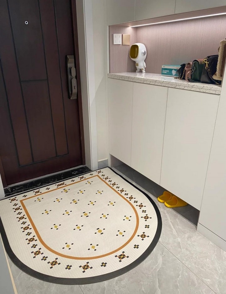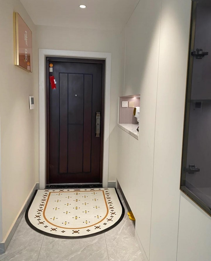 地毯設計在入口,規避進門鞋底帶來的灰塵和雜物,使室內環境更清潔、更舒適。墻上的電表箱被裝飾畫覆蓋,豐富了進入的氛圍,也讓影響美觀的電表箱沒有表現的機會。