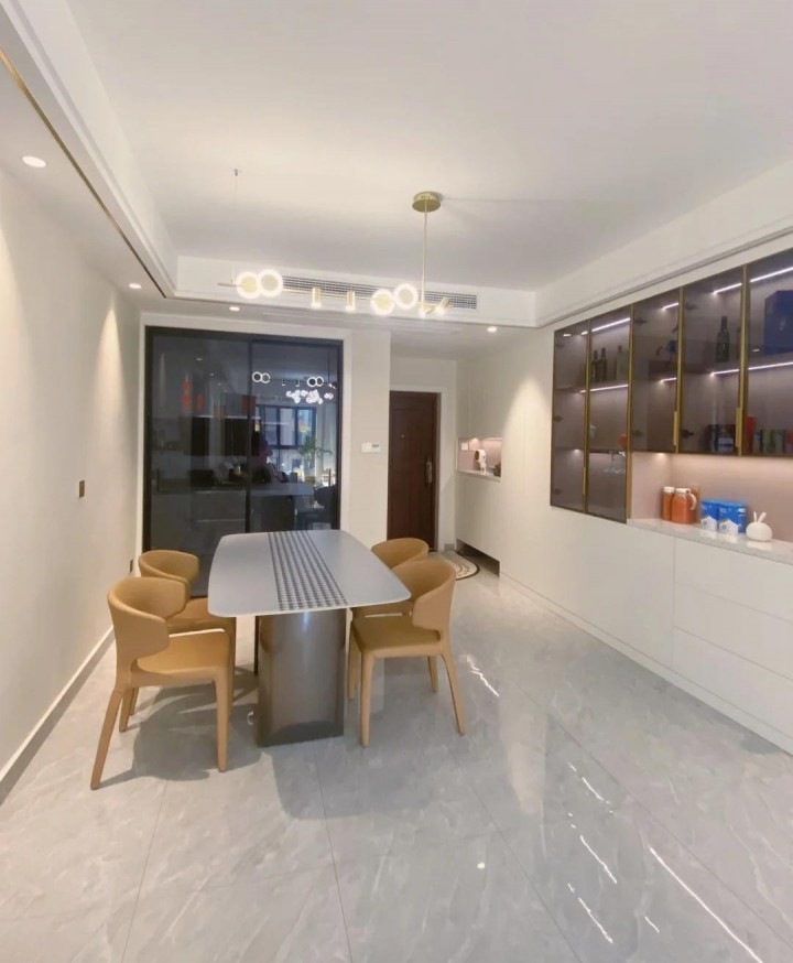 定制的餐柜與鞋柜融為一體,儲物空間非常大。上部主要由玻璃門制成,用作酒柜?;疑牟A渖蠠魩?,檔次感立刻提升,很好地凸顯了出來。根據業主的品味和風格,適合在中間空間放置一些小家電,以緩解廚房的壓力。