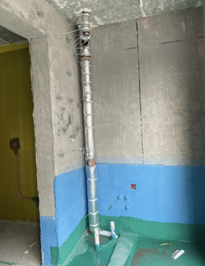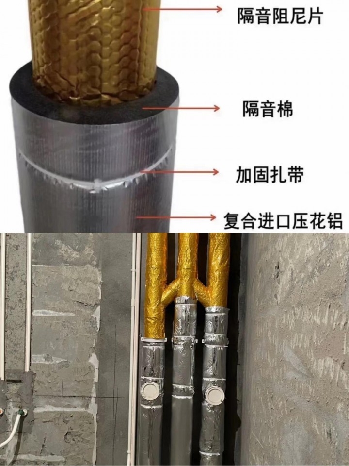 3、針對“室內管道的噪音”→包隔音棉+阻尼片,貼磚密封