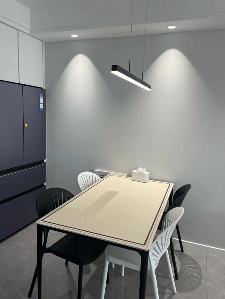 墻面直接刷的純色乳膠漆,單純從色調上來看,應該是“太空漫步”。在吊頂方面,沒有做全屋吊頂,而是做了“回型藏燈吊頂”,仔細看會發現回型吊頂也做了雙眼皮的設計。