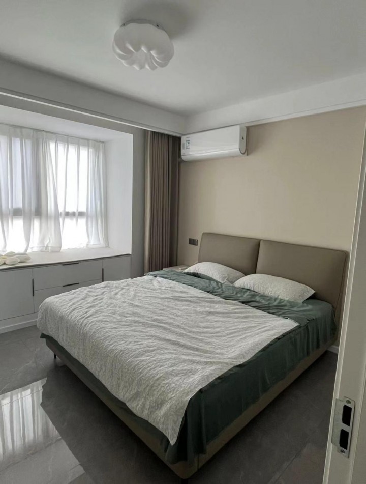 臥室的墻面依舊是刷純色乳膠漆,頂面選擇了雙眼皮吊頂(實際上就是雙層石膏板上下錯開2-3公分的效果),衣柜做了一門到底,飄窗砸掉做成了收納柜,沒有裝中央空調和風管機空調,而是安裝了壁掛空調。