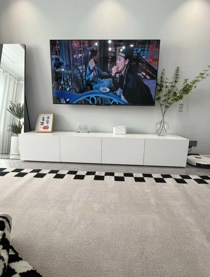 很多人說“乳膠漆電視墻”,是十年前的做法,現在早就過時了,流行的是“滿墻電視柜”和“巖板格柵背景墻”。