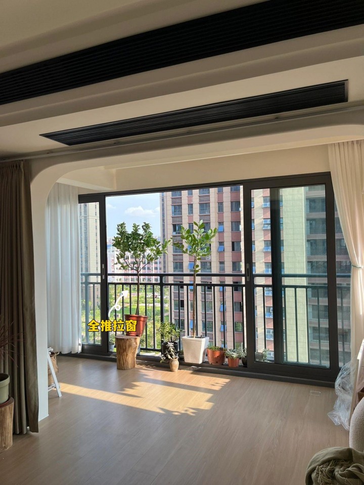 對于想做開放式陽臺的朋友,不妨試一下全推拉窗,也可以稱之為推拉門,整體開窗面積能達到50%以上,比半對開推拉窗的通風效果還要好一半以上。