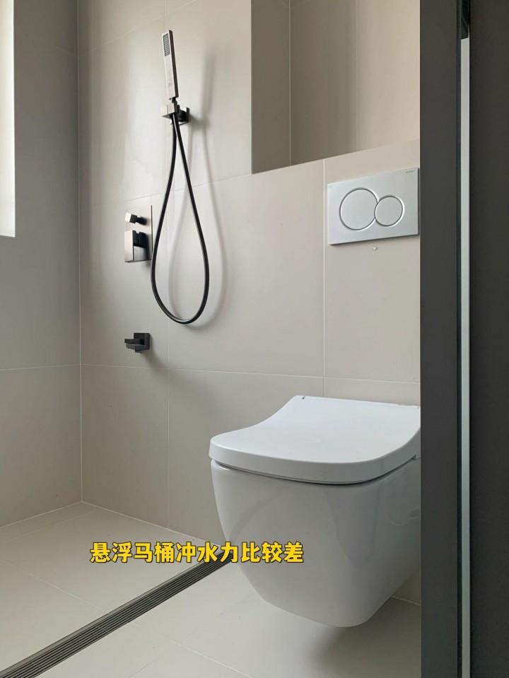 最讓人難過的是,費老勁裝了懸浮馬桶,水箱沖水居然沒勁!主要原因是懸浮馬桶改造了水管,只能選擇直沖式的沖水方式,沖水效果遠不如虹吸式,很容易出現馬桶壁留污的問題。