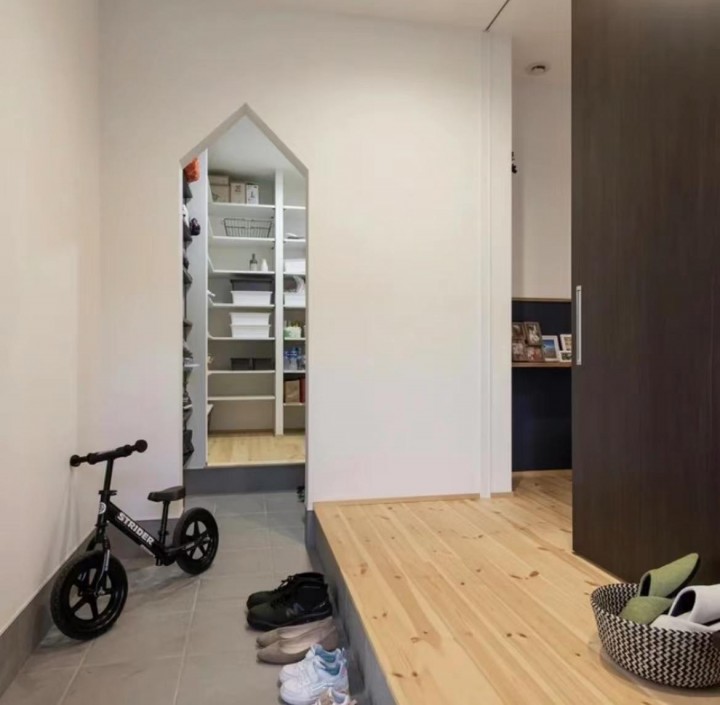 日本的房子,除了在入戶的地方做了下沉式玄關外,還會在旁邊做個儲物間,用來放鞋子、運動用品、嬰兒車、雨傘、工具、快遞等雜物。