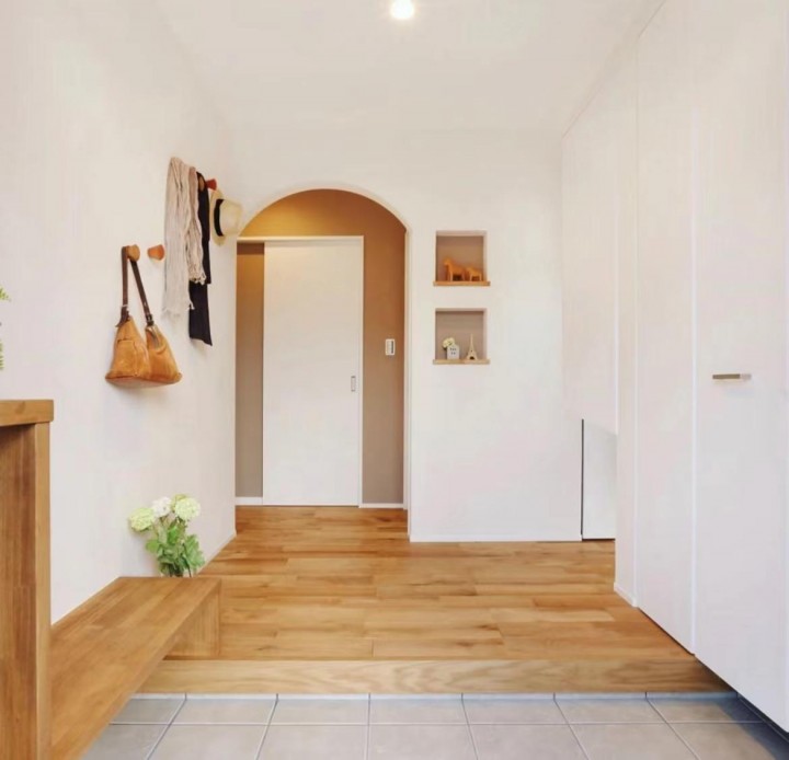 下沉式玄關算是日本房子的一個特色,基本上很多現代家庭都采用這樣的設計。玄關處相當于一個落塵區,確保室外的塵土不被帶入室內,減輕了打掃衛生的負擔。另外,下沉式玄關的高低差會給人明顯的視覺分區,將玄關與室內空間劃分出來,增加空間的層次感。如果勤于打掃的話,抬高的區域還能直接做換鞋凳,坐在地上換鞋,非常方便。