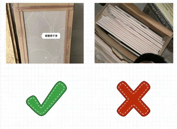 4.瓷磚進場要在場,檢查瓷磚有無標識,標識是否同一色號、批次,有無缺陷破損。檢查有無標識,是因為正規(guī)品牌的瓷磚通常會有標識,這能體現(xiàn)產(chǎn)品的正規(guī)性和可追溯性。如果沒有標識,可能產(chǎn)品來源不明或質(zhì)量難以保證。關(guān)注色號和批次是否同一,是因為即使是同一型號的瓷磚,不同批次在顏色、紋理等方面可能會存在細微差異。如果不統(tǒng)一,鋪貼后可能會出現(xiàn)明顯的色差或紋路不連貫,嚴重影響美觀效果,導(dǎo)致整體裝飾效果不協(xié)調(diào)。檢查有無缺陷破損則直接關(guān)系到瓷磚本身的質(zhì)量。有缺陷破損的瓷磚在鋪貼后可能會出現(xiàn)裂縫、不平整等問題,影響使用性能和耐久性,后續(xù)還可能需要進行修補或更換,增加額外的成本和麻煩。所以在鋪貼前進行這樣細致的檢查是確保瓷磚鋪貼質(zhì)量和最終效果的關(guān)鍵步驟。
