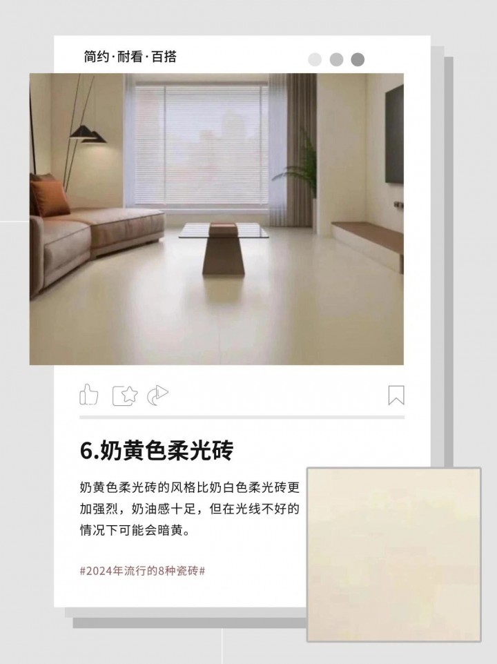 奶黃色柔光磚在風格上比奶白色柔光磚更加強烈,其奶油感更加濃郁。然而,在光線不足的情況下,可能會顯得稍微暗黃,因此在選擇時需要考慮空間的采光條件。