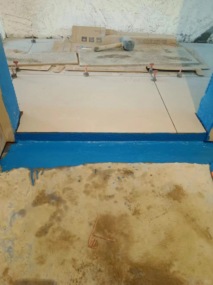 這時候一定先不要貼衛生間里面的地磚,先用水不漏或者防水膠把這個砂漿層的側面刷上,并且用水不漏把門口地磚兩側的縫隙也填上,等這個側面的防水或者水不漏干了之后再貼衛生間的地磚。