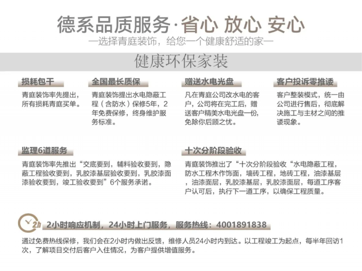 不僅如此,青庭裝飾引入了德系建材,這些高品質材料以其卓越的性能和環保標準,為家裝質量提供了堅實保障。從環保的板材到經久耐用的五金,每一種材料都經過層層篩選,只為提升業主的生活品質。