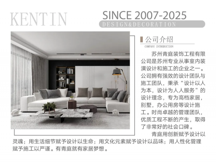 在蘇州這座充滿詩意與韻味的城市,有一家在裝飾領域嶄露頭角的企業 —— 蘇州青庭裝飾。本公司成立于2007年,至今已有18個年頭,它宛如一顆璀璨的新星,以獨特的企業文化為畫筆,精心勾勒出一幅幅品質家居的絢麗畫卷。