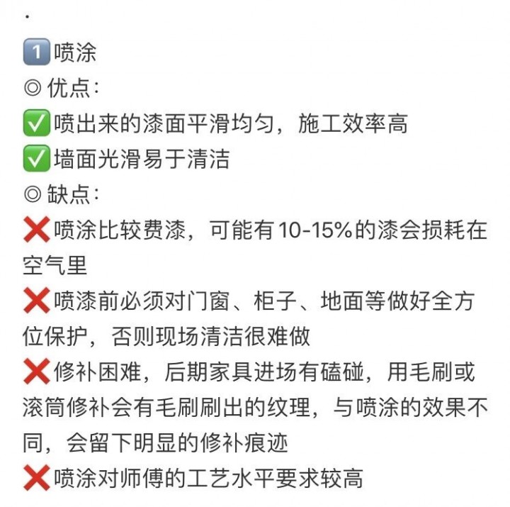 墻面則選滾涂,因為后期難免有磕碰需要修補,噴涂的墻面修補后會有明顯痕跡,滾涂的修補痕跡相對不明顯。當然,你也可以根據(jù)自己的實際需求選擇,附上兩者的優(yōu)缺點供參考: