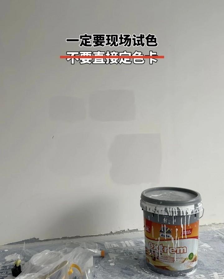 你家是你家,別人家是別人家,千萬不要盲選網紅色!每家的采光條件不同,顏色順著光看和背著光看也完全不同。所以,最適合你家的顏色一定不在色卡上,而在你家里。建議調好色漿,帶到現場調色,小面積試刷滿意后再整面刷,這樣才最保險。