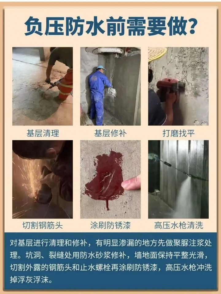 負壓防水系統是目前應對土壤滲水的有效方案。專業施工流程包括三個關鍵步驟:首先對基面進行徹底清理打磨,確保平整無塵;然后采用丙烯酸鹽灌漿料進行帷幕注漿,形成防水帷幕,可使滲漏率降低 90% 以上;最后涂刷三遍負水壓防霉抗滲膠泥,形成能承受高水壓的堅韌防水層。這種內防水方式特別適合已建成的建筑,但需注意一旦完成,墻面和地面的防水層就不能被破壞,后續開槽或安裝柜體必須另砌墻體。