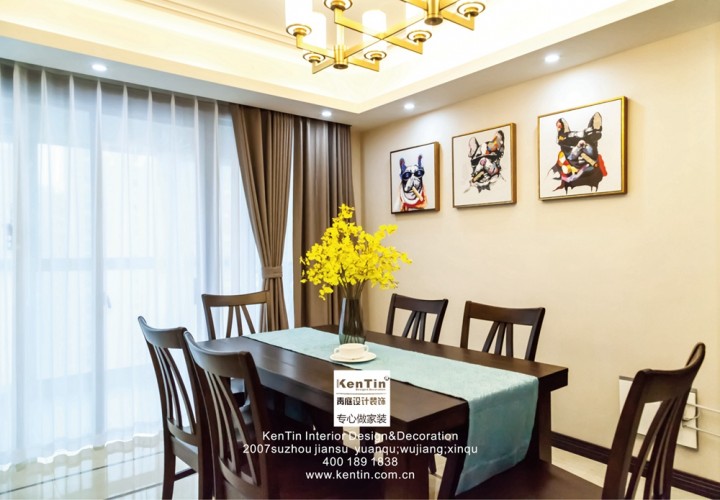 第一眼看見的就是掛在純色墻上的三幅壁畫,灑脫不羈、各有神態的三只狗狗與追求簡美風格的主人一樣的向往自由。黃色的花為厚實的實木餐桌增添了幾分活力,與暖色的吊頂燈光相得益彰。