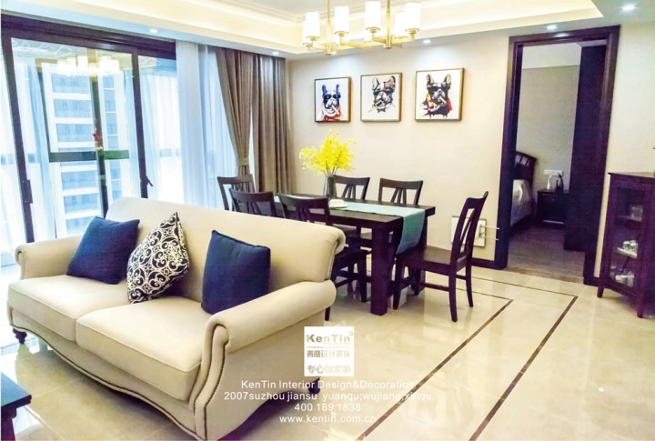 布藝沙發和實木家具是簡美風格的一貫追求,簡約大氣,花色的沙發溫馨之余帶有一絲俏皮,落地窗的設計保證了良好的采光度,簡潔明亮。客餐廳一體的設計,寬敞明亮,協調的顏色更顯空間感和整體感。
