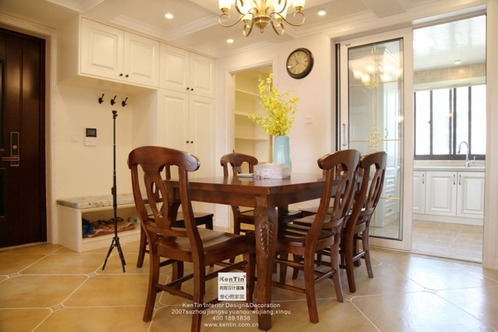 餐廳與客廳的格調相一致,以簡單歐式的設計,配合暖色燈光的基調,簡單生活不失雅致??蛻粝矚g簡單,永不過時的顏色,簡約不簡單,按著這個理念,給客戶設計加上了一些留白,精細的工藝,整體簡潔的造型營造了一個良好的用餐和休息環境。