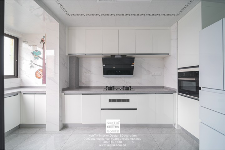 廚房延續客廳純白風格,看起來干凈溫馨,空間開闊,注入享受烹飪時光的靜謐與雅致。