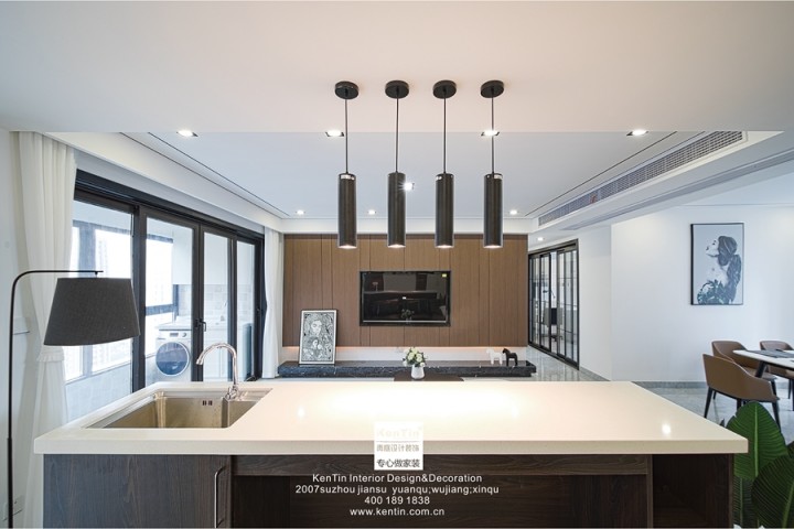 沙發背面是小吧臺,白色大理石臺面顯得簡約大方,在燈光的照耀下充滿情調,日常可以親手制作食物或是辦公。由于客戶是一家五口居住,對儲物需求更高,所以吧臺后增加許多儲物柜滿足生活需求。
