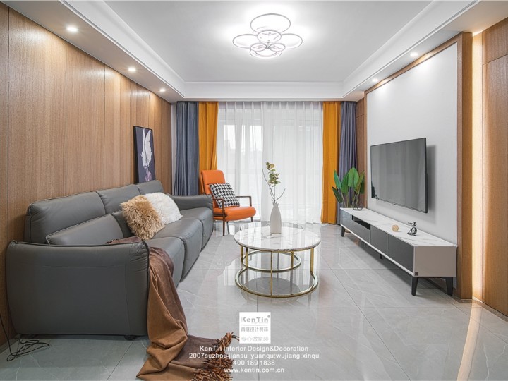 屋主比較偏愛明亮簡潔的感覺,結合房型特點和業主喜好,本案在設計風格上選取現代元素。縱觀整個客餐廳設計,木飾面的使用很有特點,線條感極強,簡單大方。同時也打造了更多的儲物空間。