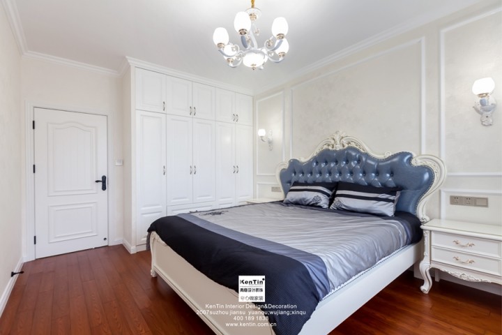 主臥空間溫馨簡單,線條突出空間的縱深感,床品、背景、衣柜、窗簾等元素都是歐式風格的體現,深藍+白色的搭配也可以這么美。
