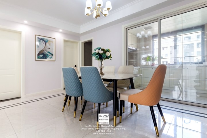 餐桌桌面采用大理石材質(zhì),清爽簡約并容易清理。桌上的花束也與家具色調(diào)一致,恰如其分,更添溫馨。撞色搭配的餐椅顏色亮麗卻不跳脫,為沉穩(wěn)的空間增添活力。