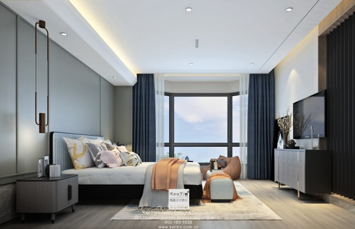 灰色的空間寧靜優(yōu)雅,對(duì)稱的家具,對(duì)稱的背景墻,整齊劃一,視覺極度舒適。