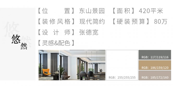 項(xiàng)目住址:東山景園 建筑面積:420平 設(shè)計(jì)風(fēng)格:現(xiàn)代簡約 設(shè)計(jì)師:張德寬 硬裝預(yù)算:80萬
